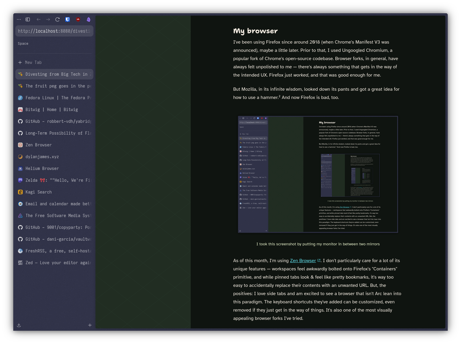 I've been using Firefox since around 2018 (when Chrome's Manifest V3 was announced), maybe a little later. Prior to that, I used Ungoogled Chromium, a popular fork of Chrome's open-source codebase. Browser forks, in general, have always felt unpolished to me β there's always something that gets in the way of the intended UX. Firefox just worked, and that was good enough for me.